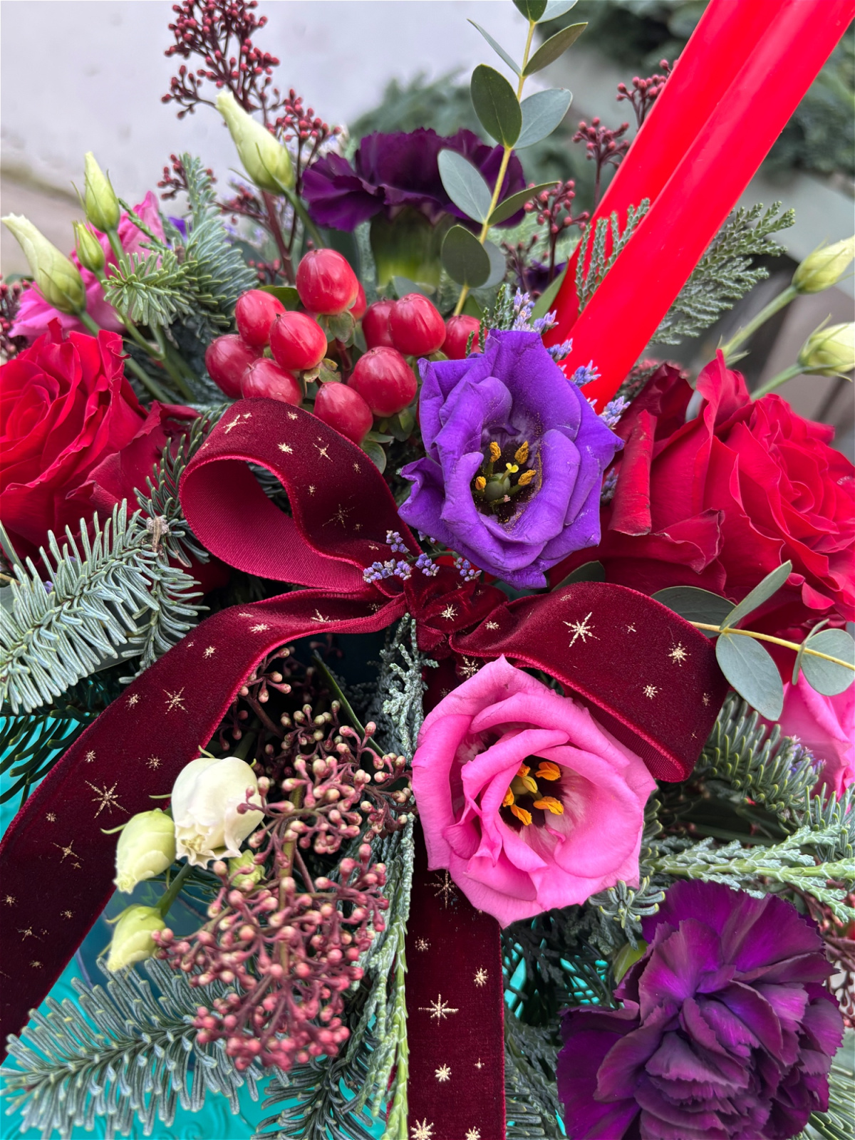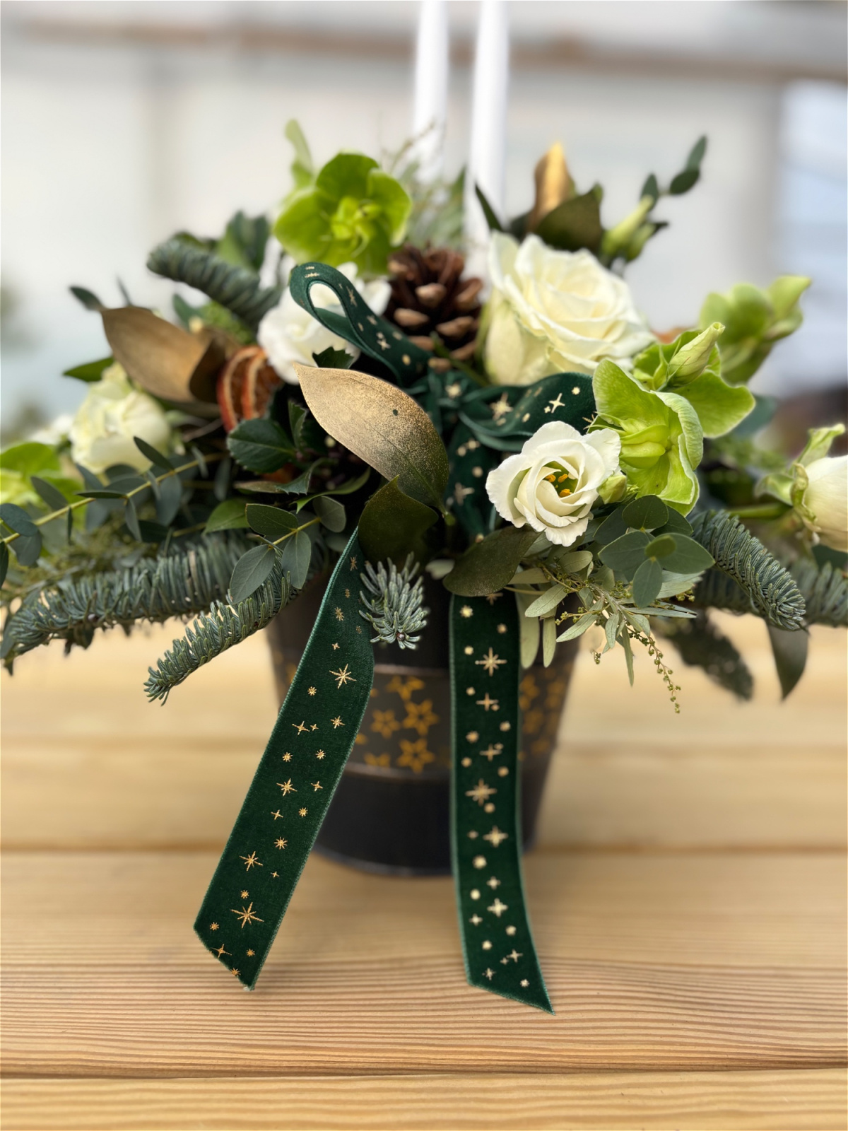 Dark blue with gold stars tin container filled with beautiful Christmas florals and foliage.