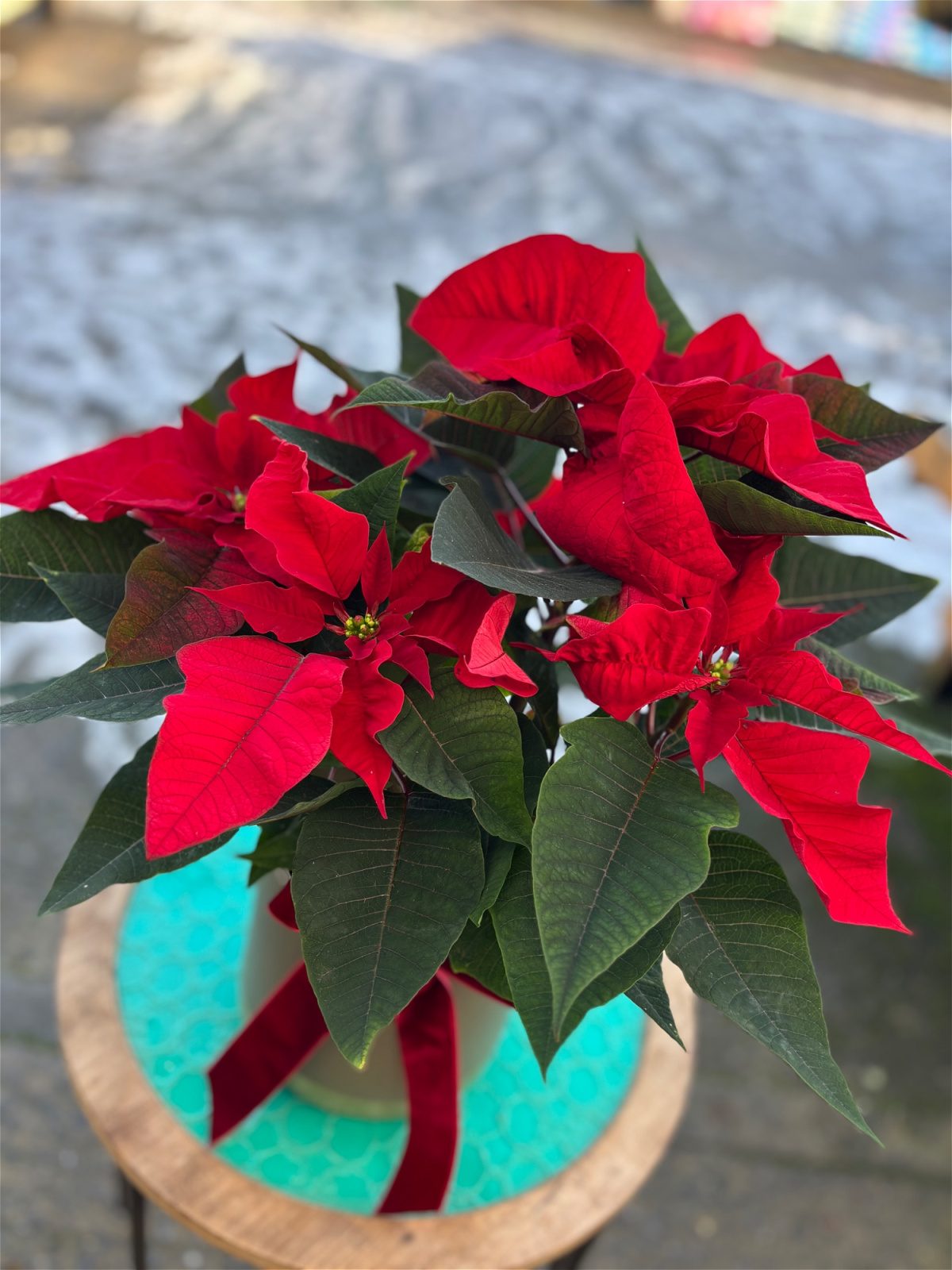 Beautiful bold red poinsettia in a lovely ceramic pot with a Christmas pick and velvet bow.